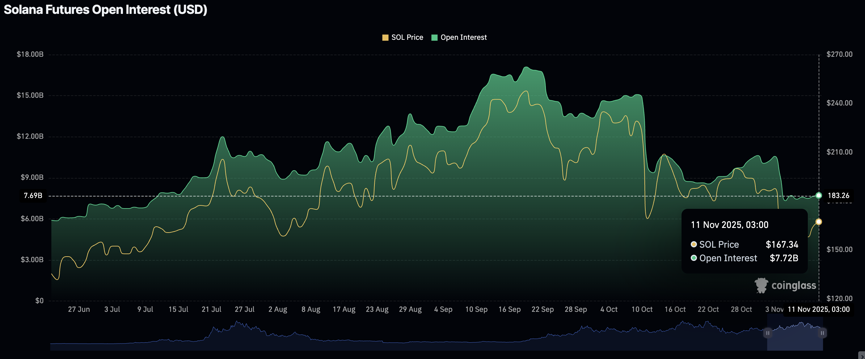 El mercado de derivados de Solana no se ha recuperado desde el evento de desapalancamiento del 10 de octubre, que liquidó más de 19 mil millones de dólares en activos criptográficos en un solo día. Según datos de CoinGlass, el interés abierto (OI) de futuros promedia 7.72 mil millones de dólares el martes, en comparación con 10 mil millones de dólares el 1 de noviembre y 14.83 mil millones de dólares el 1 de octubre.