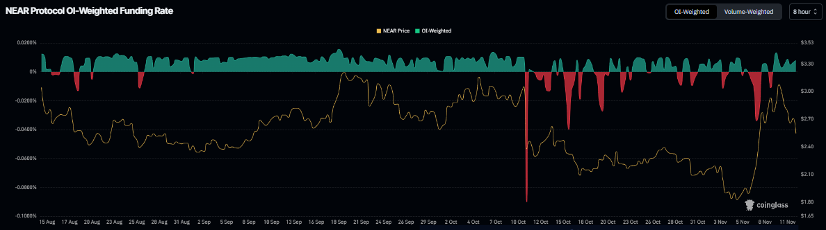 En el lado de los derivados, NEAR parece estar preparado para un rally de recuperación, ya que los datos de la tasa de financiación ponderada por OI de Coinglass muestran que el número de operadores que apuestan a que el precio de Near Protocol caerá más es menor que aquellos que anticipan un aumento de precio. La métrica se volvió positiva el domingo y se situó en 0.0079% el miércoles, indicando que los largos están pagando a los cortos y sugiriendo un sentimiento alcista.