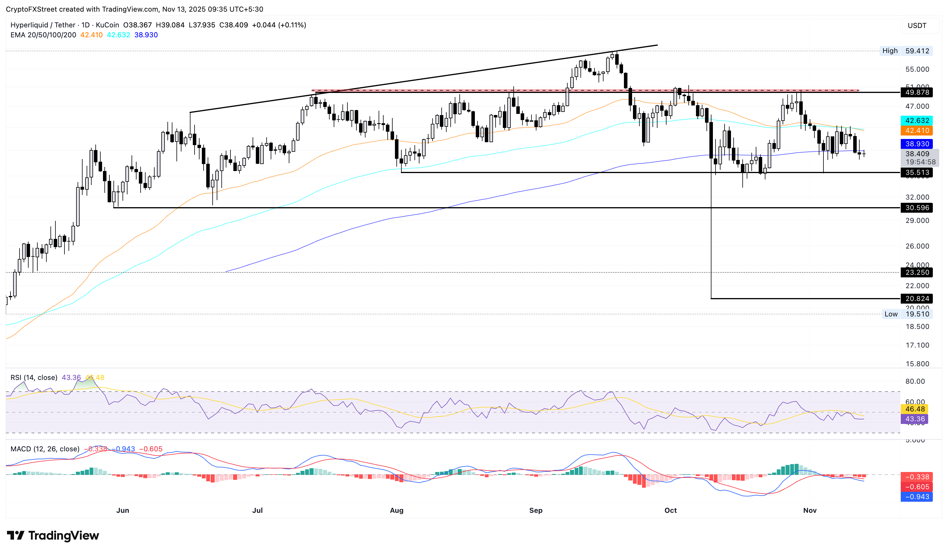 Hyperliquid cotiza por debajo de la media móvil exponencial (EMA) de 200 días en casi 39$ tras no lograr superar las EMAs de 50 y 100 días cerca de 43$. La reversión amenaza el soporte de 35$ previamente probado el 4 de noviembre, ya que el Indicador de Convergencia/Divergencia de Medias Móviles (MACD) se extiende por debajo de la línea de señal, implicando una oportunidad de venta.
