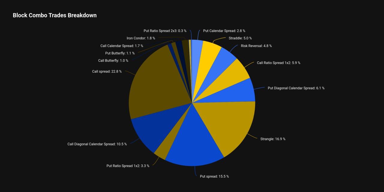 En el caso de ETH, las estrategias de straddles y strangles representaron en conjunto poco más del 8 % del flujo total de bloques durante la última semana.