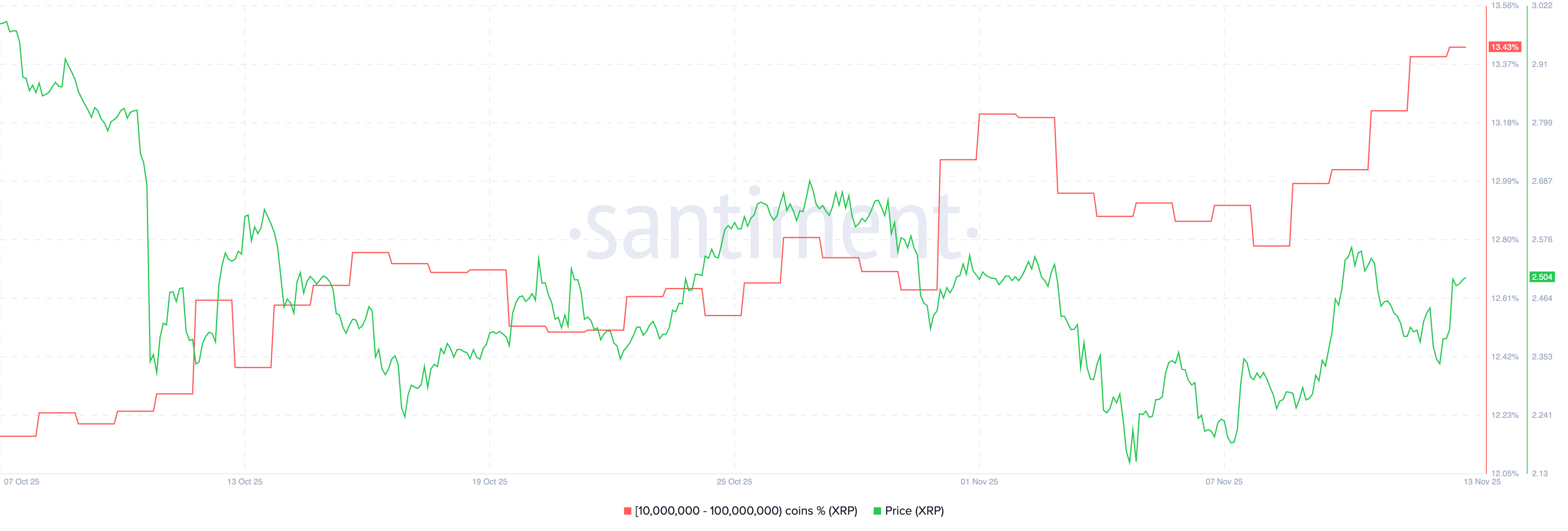 Los datos de Santiment muestran que las billeteras que mantienen entre 10 millones de XRP y 100 millones de XRP han crecido para representar el 13.43% del suministro total, desde el 12.25% del 10 de octubre.