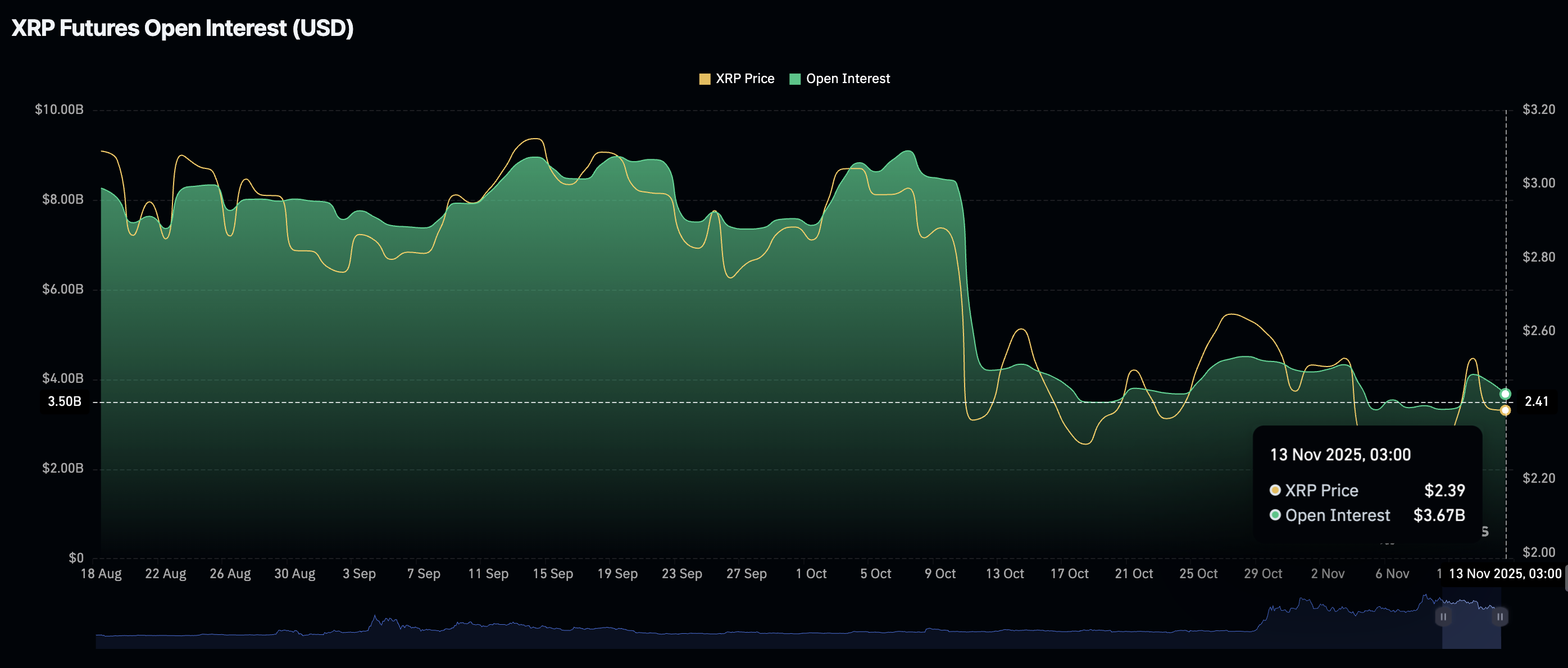 Sin embargo, la demanda minorista de XRP no se ha recuperado desde mediados de octubre, caracterizada por un mercado de derivados débil. Los datos de CoinGlass muestran que el Interés Abierto (OI) de futuros promedia 3.67 mil millones de dólares el jueves, bajando de 3.95 mil millones de dólares el miércoles y 4.11 mil millones de dólares el martes.