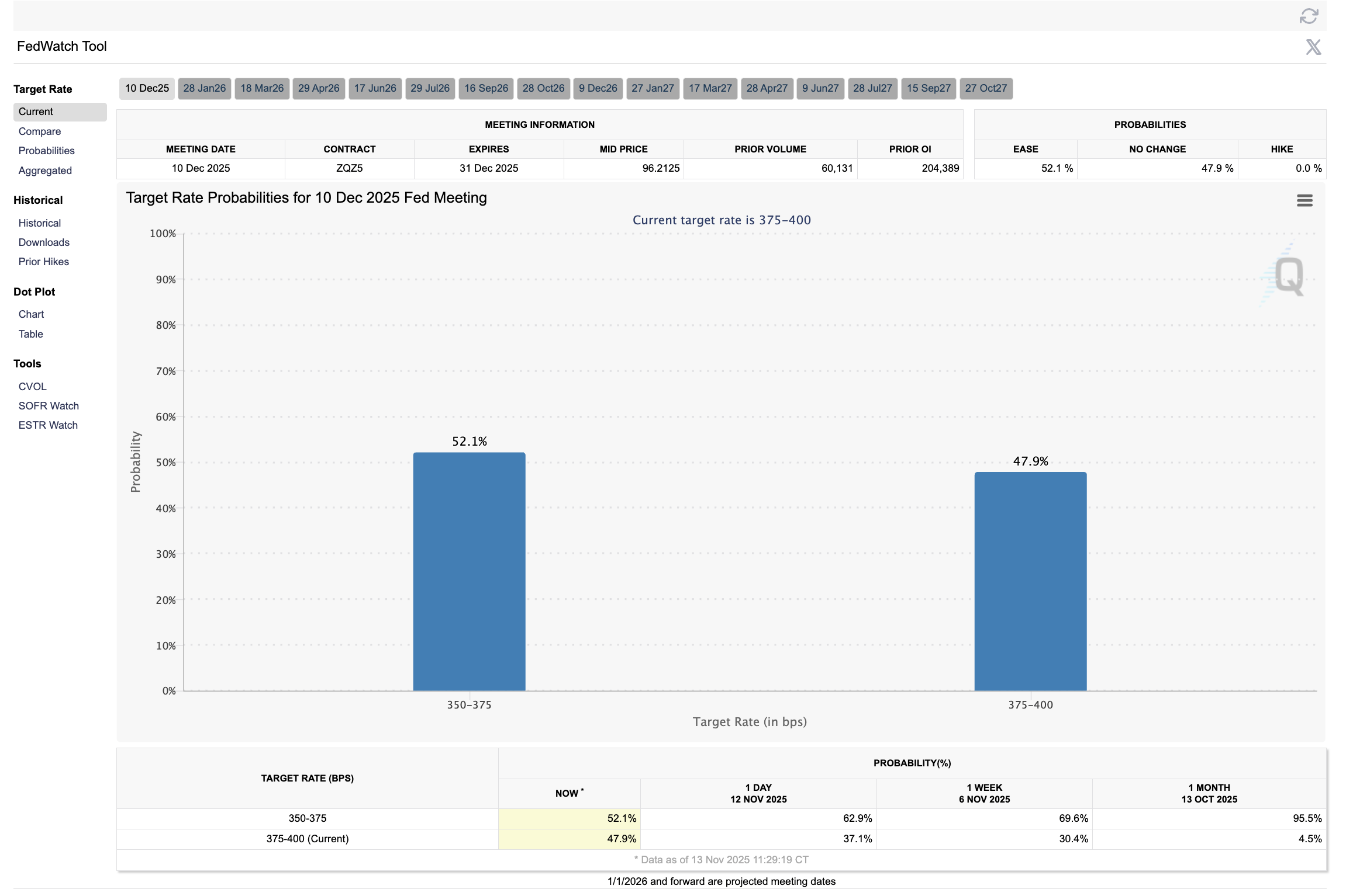 Según la herramienta CME FedWatch, el mercado actualmente valora en un 52% las probabilidades de que la Fed reduzca las tasas de interés en 25 puntos básicos (pb) en su reunión de diciembre, bajando del 62.9% del jueves, como se informó anteriormente por FXStreet.