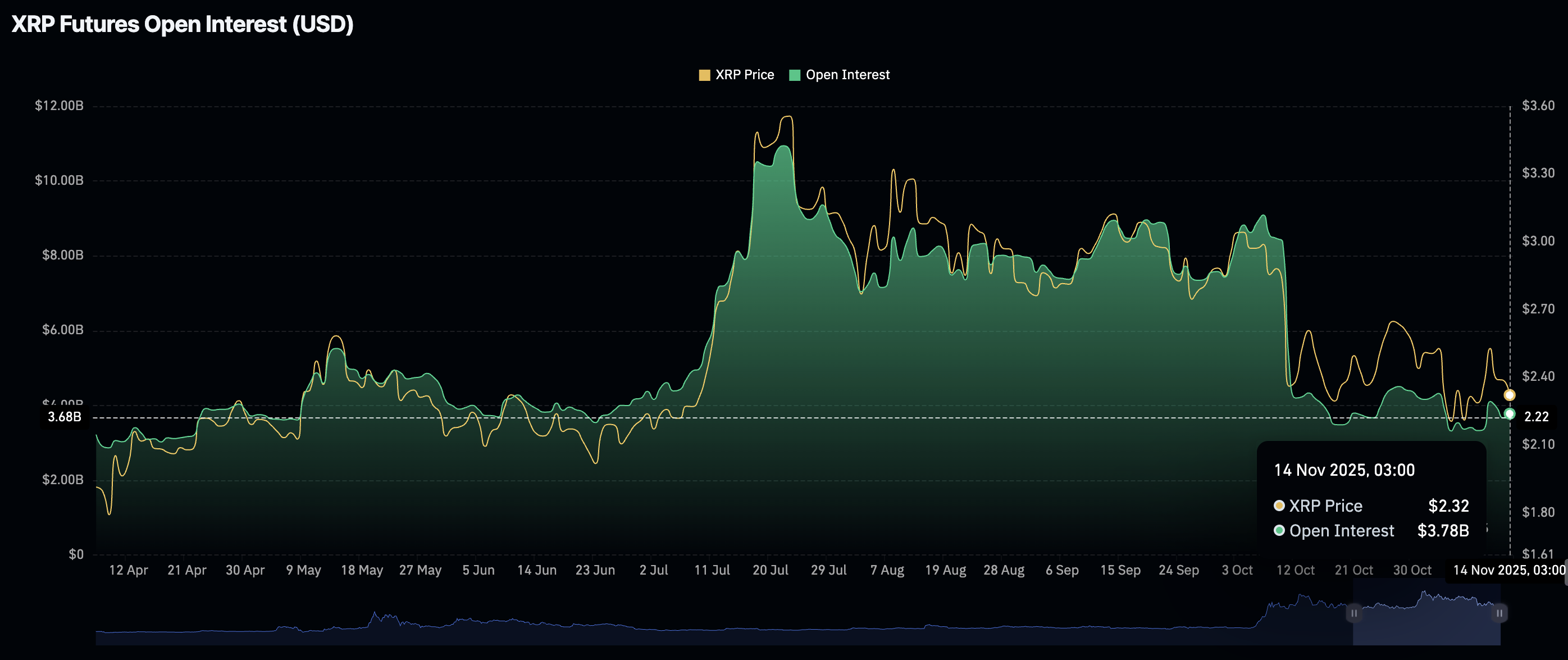 Mientras tanto, la demanda minorista de XRP no se ha recuperado desde mediados de octubre, caracterizada por un mercado de derivados débil. Los datos de CoinGlass muestran que el interés abierto de futuros (OI) promedia 3.78 mil millones de dólares el viernes, ligeramente por encima de los 3.67 del día anterior, pero por debajo de los 4.17 mil millones registrados el 1 de noviembre.