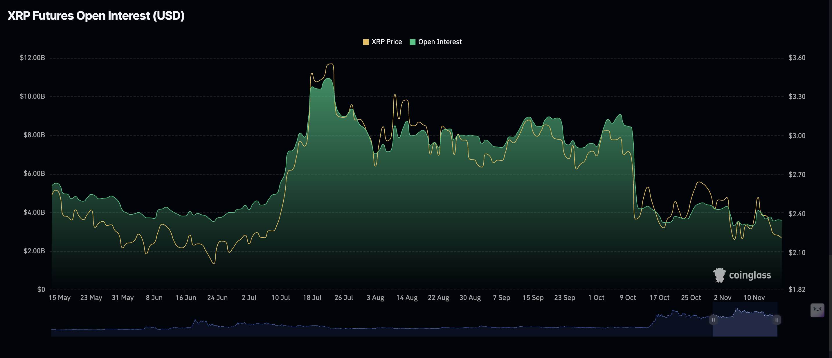 Mientras tanto, la demanda minorista de XRP no se ha recuperado desde mediados de octubre, caracterizada por un débil mercado de derivados. Los datos de CoinGlass muestran que el interés abierto (OI) de futuros promedió 3.61 mil millones de dólares el lunes, un ligero retroceso desde los 3.63 mil millones de dólares del día anterior, pero significativamente por debajo de los máximos históricos de 10.94 mil millones de dólares registrados el 22 de julio.