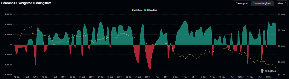 Aparte de las condiciones subvaluadas, los datos de derivados también apoyan un repunte de recuperación para Cardano. Los datos de Tasa de Financiación Ponderada por OI de Coinglass muestran que el número de traders apostando a que el precio de ADA caerá más es menor que aquellos que anticipan un aumento de precio.