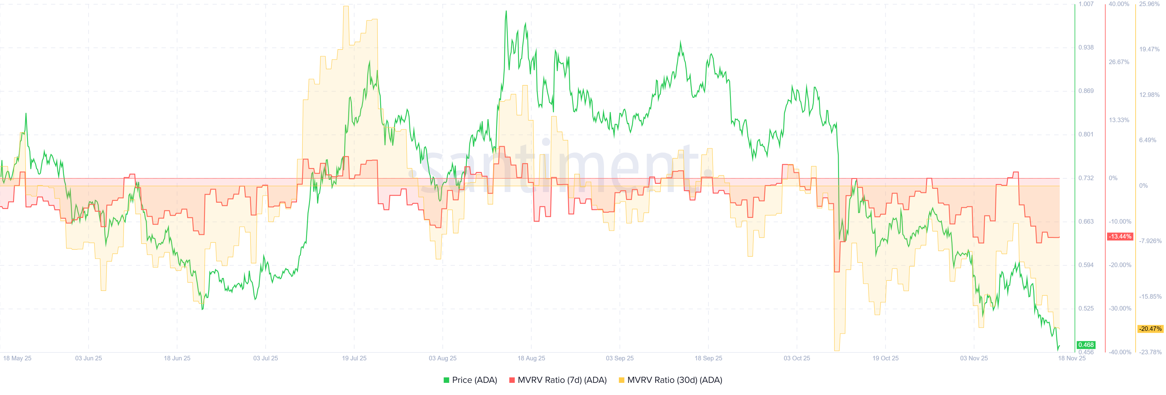 Estos valores negativos de MVRV podrían interpretarse como una señal de compra, aumentando probablemente la presión de compra sobre el token en los intercambios de criptomonedas. Históricamente, cuando el MVRV ha caído a niveles similares, el precio de ADA a menudo se ha recuperado.