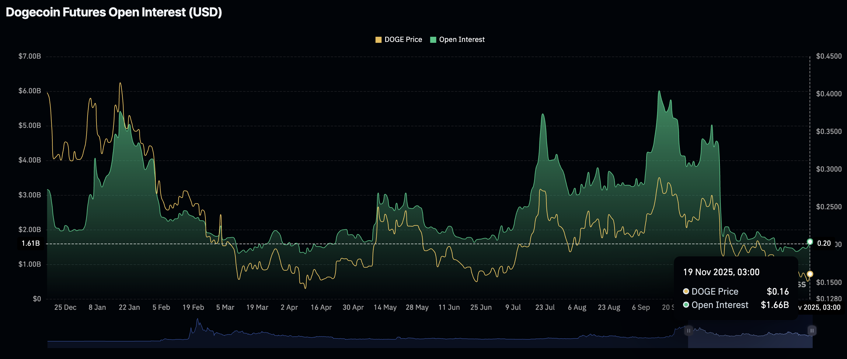 El mercado de derivados de Dogecoin se está estabilizando, apoyado por el aumento del OI de futuros a 1.66 mil millones $ el miércoles. Tras el masivo desapalancamiento del 10 de octubre, el OI de DOGE cayó a 1.37 mil millones $ el 7 de noviembre, destacando una aversión al riesgo persistente.