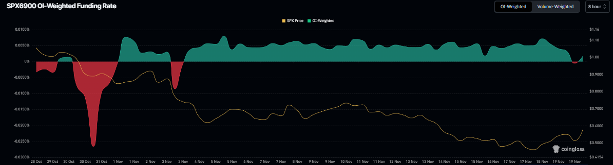 Los datos de derivados también apoyan un rally de recuperación para SPX6900, ya que los datos de tasa de financiación ponderada por OI de Coinglass muestran que el número de operadores que apuestan a que el precio de SPX caerá más es menor que aquellos que anticipan un aumento en el precio.