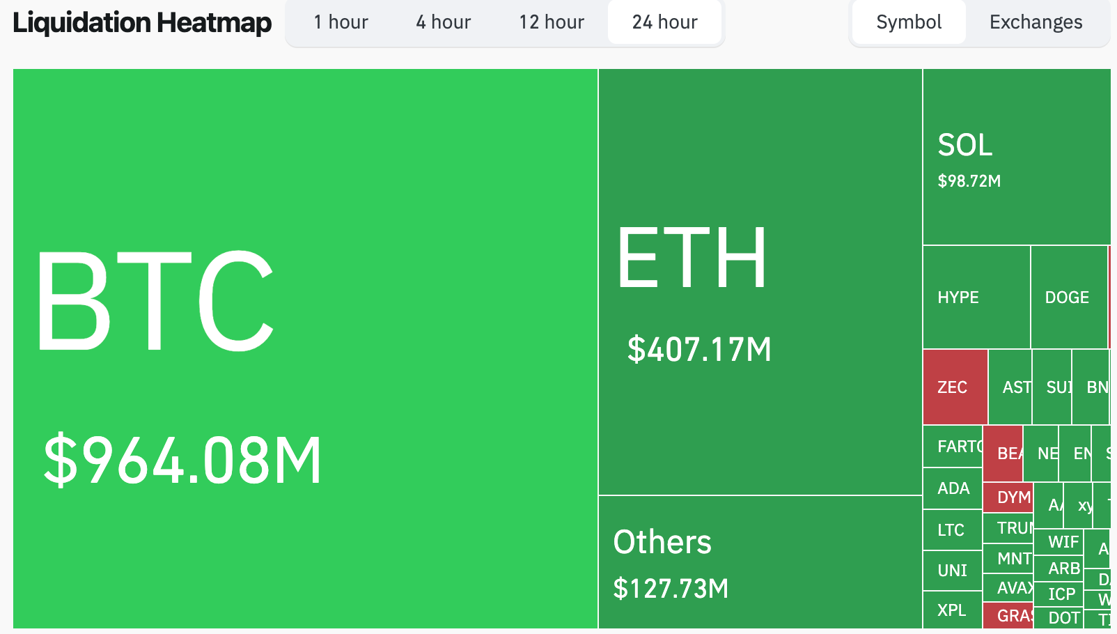 La venta masiva coincide con casi 2 mil millones de dólares en liquidaciones en las últimas 24 horas, según datos de CoinGlass. Bitcoin representó 964 millones de dólares de ese total, seguido por ether con 407 millones de dólares y una amplia ola de liquidaciones forzadas en altcoins.