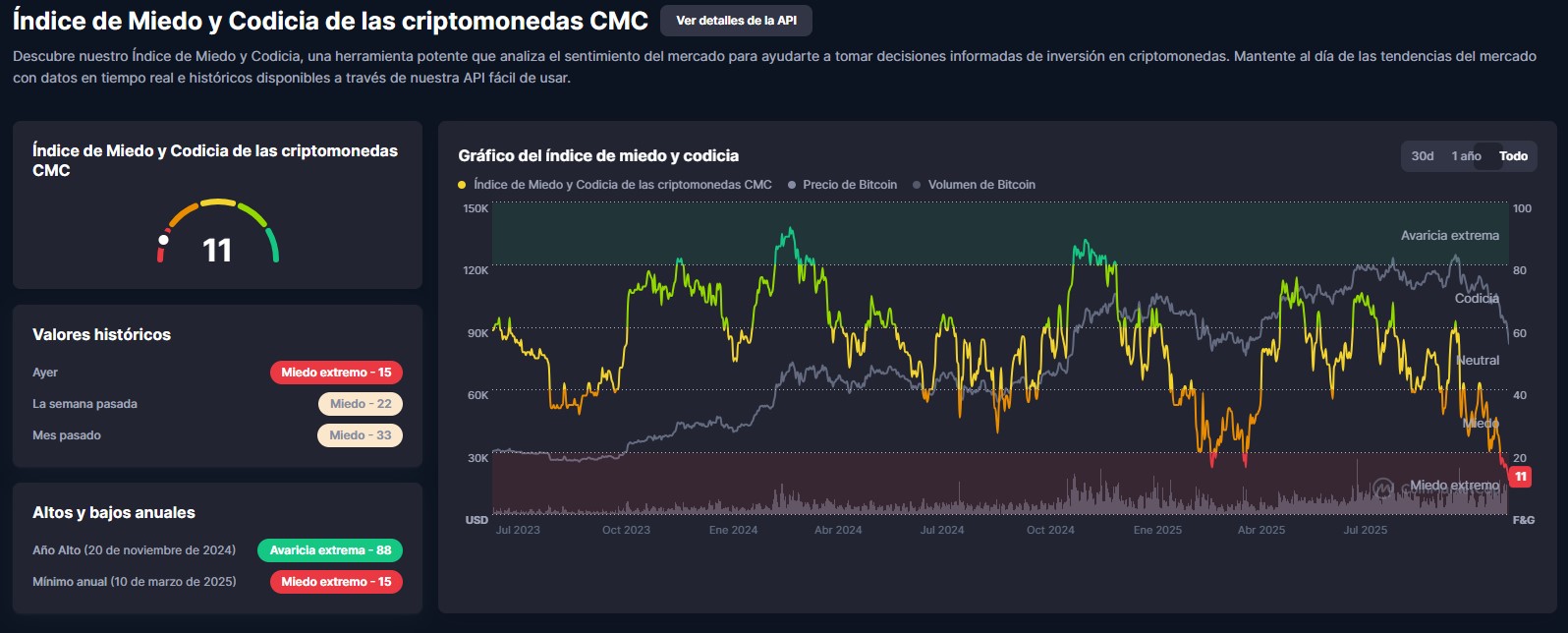El índice de miedo y codicia de CoinMarketCap cayó este 21 de noviembre hasta 11 puntos, una zona catalogada como «miedo extremo». Se trata del nivel más bajo registrado en seis meses y coincide con una acelerada corrección en el precio de bitcoin.