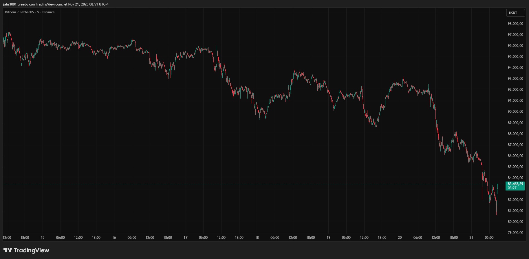Este deterioro coincide con una marcada caída en el precio de la moneda digital, que se aproxima a la zona de 80.000 dólares, tal como se observa en el gráfico de TradingView a continuación: