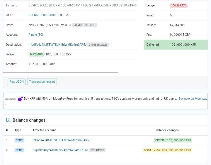 Ripple transfiere 102 millones de XRP a una billetera inactiva, generando interés en el mercado