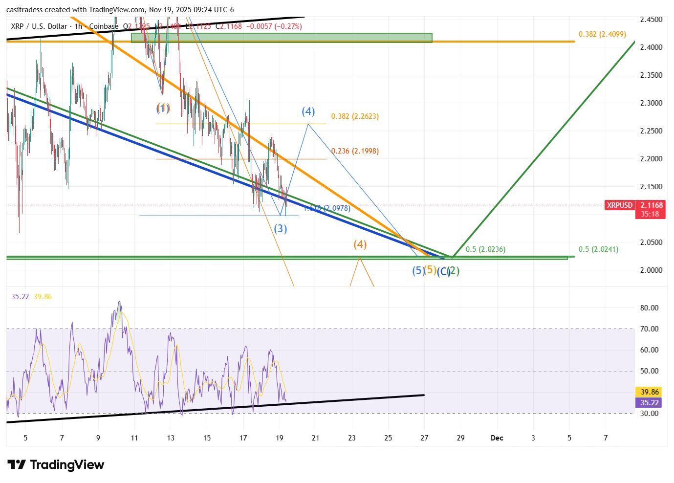 Además, los indicadores técnicos respaldan este escenario. El RSI muestra una divergencia alcista, lo que indica un debilitamiento de la presión bajista y una posible reversión del mercado. Según CasiTrades, la continua fluctuación del precio de XRP mantiene esta divergencia, lo que aumenta la probabilidad de que 2.03 dólares marque el mínimo final.
