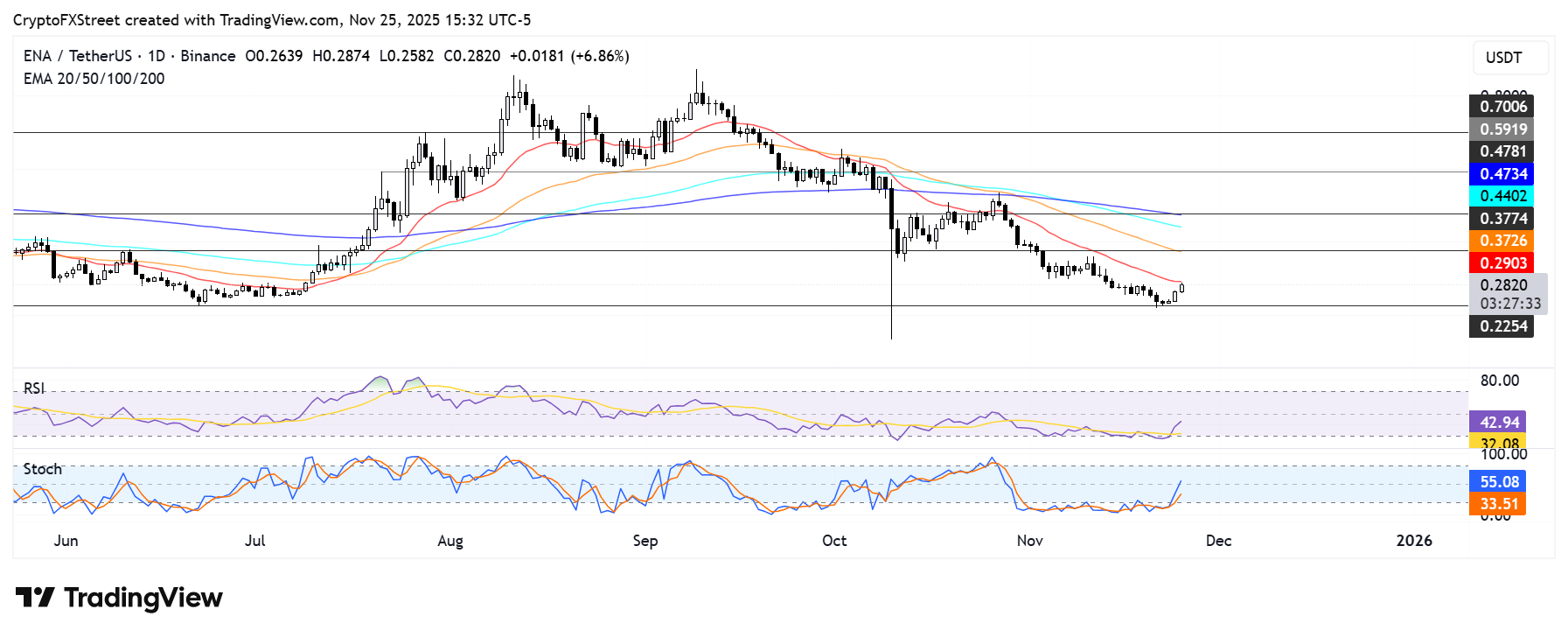 El token del protocolo de stablecoin sintético comenzó una recuperación después de que una billetera vinculada a su empresa matriz Ethena Labs comprara 25 millones de ENA por un valor de 6,7 millones de dólares, según el rastreador de billeteras inteligentes Onchain Lens. La billetera ha acumulado 286,15 millones de ENA en las últimas tres semanas.
