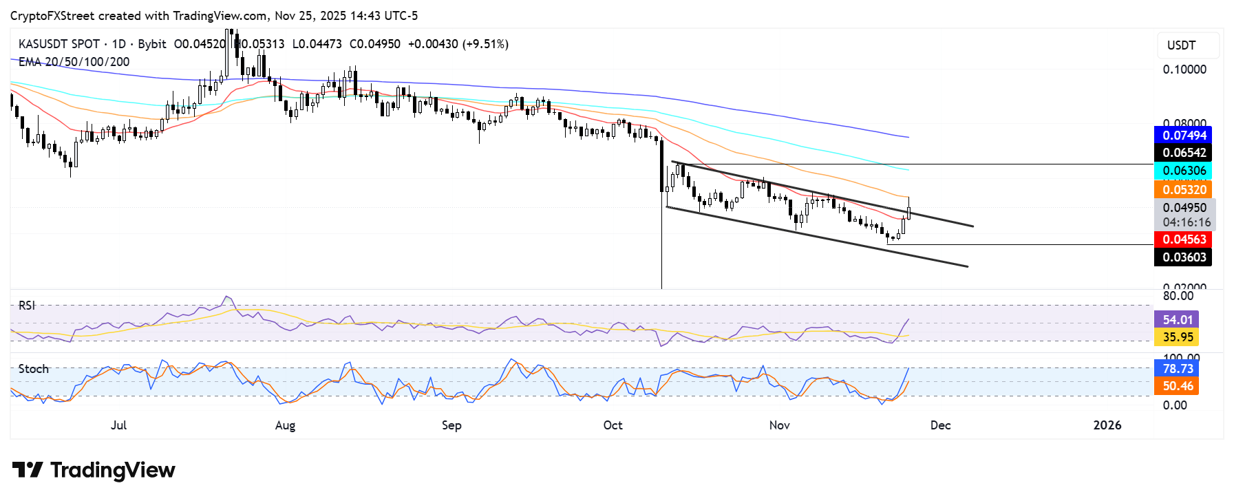 En la parte baja, KAS podría encontrar soporte en 0,036$ si no logra mantenerse por encima del límite superior del canal.