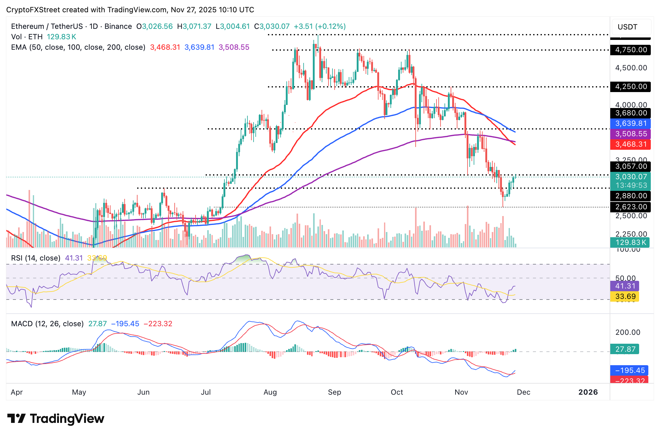 Ethereum se mantiene por encima de 3.000$ en el momento de escribir el jueves, mientras los toros intentan recuperar el control. El RSI ha subido a 41 desde la región de sobreventa en el gráfico diario, indicando que el impulso bajista se está reduciendo y que los toros de ETH podrían empujar hacia la EMA de 50 días en 3.468$.