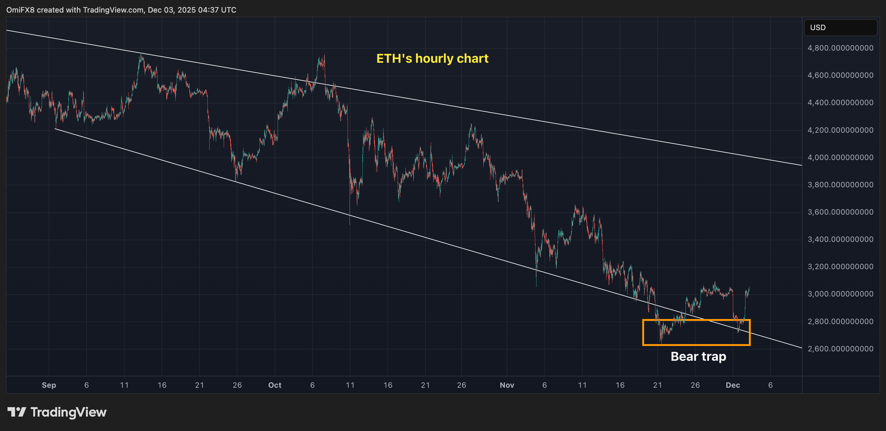 El gráfico horario de Ether ETH 2806,95 muestra una clásica trampa bajista, con la acción del precio fingiendo una ruptura por debajo del límite inferior del canal descendente antes de protagonizar un rebote.
