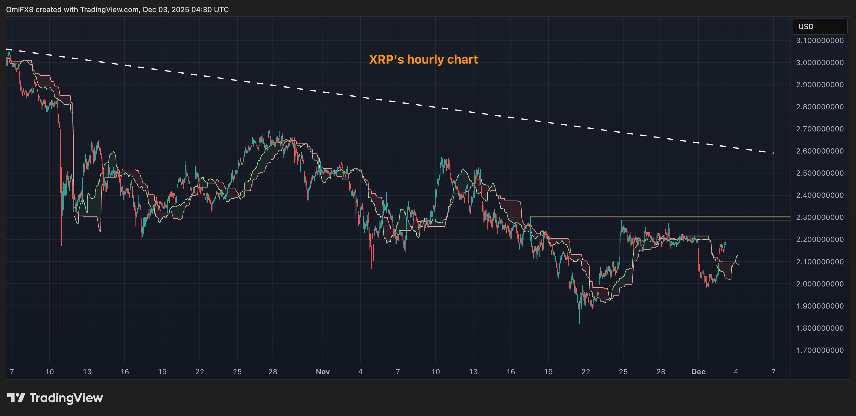 XRP 2,0183 ha vuelto a subir desde el soporte de $2, mantenido por largo tiempo, cruzando de manera alcista por encima de la nube Ichimoku en el gráfico horario. Claramente se está formando una tendencia alcista intradía, pero queda por ver si puede superar la zona de resistencia inmediata de $2.28-$2.30.