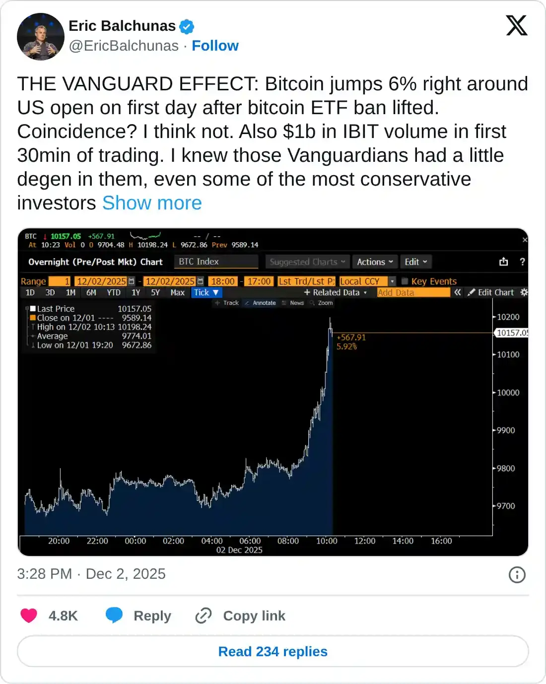 Vanguard, un gestor de activos con sede en EE.UU. con más de 11 billones de dólares en activos bajo gestión, anunció el martes que permitiría ETFs de Bitcoin en su plataforma, lo que resultó en una fuerte recuperación en los precios del BTC. Según Eric Balchunas, analista de ETFs de Bloomberg, el IBIT de BlackRock vio más de 1.000 millones de dólares en volumen de negociación en los primeros 30 minutos de negociación, lo que indica una renovada demanda institucional.
