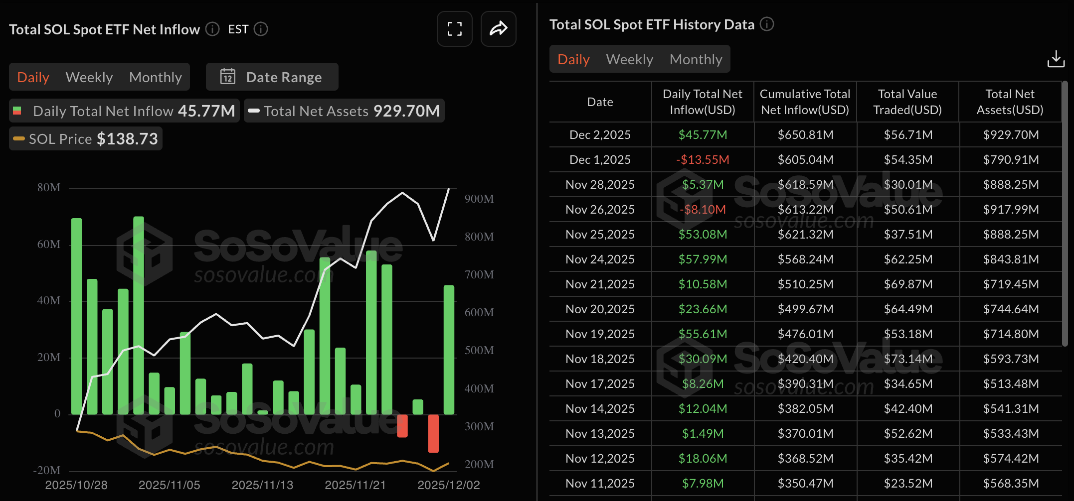 Los ETF enfocados en criptomonedas de Vanguard, que incluyen Bitcoin (BTC), Ethereum (ETH), Solana (SOL) y Ripple (XRP), están calentando el mercado de criptomonedas. Solana está experimentando una renovación en la demanda institucional con una entrada neta de 45.77 millones de dólares el martes, cambiando de una salida neta de 13.55 millones de dólares el lunes. Típicamente, un aumento en las entradas de ETF señala mejores probabilidades de una recuperación adicional y aumenta la confianza de los inversores.