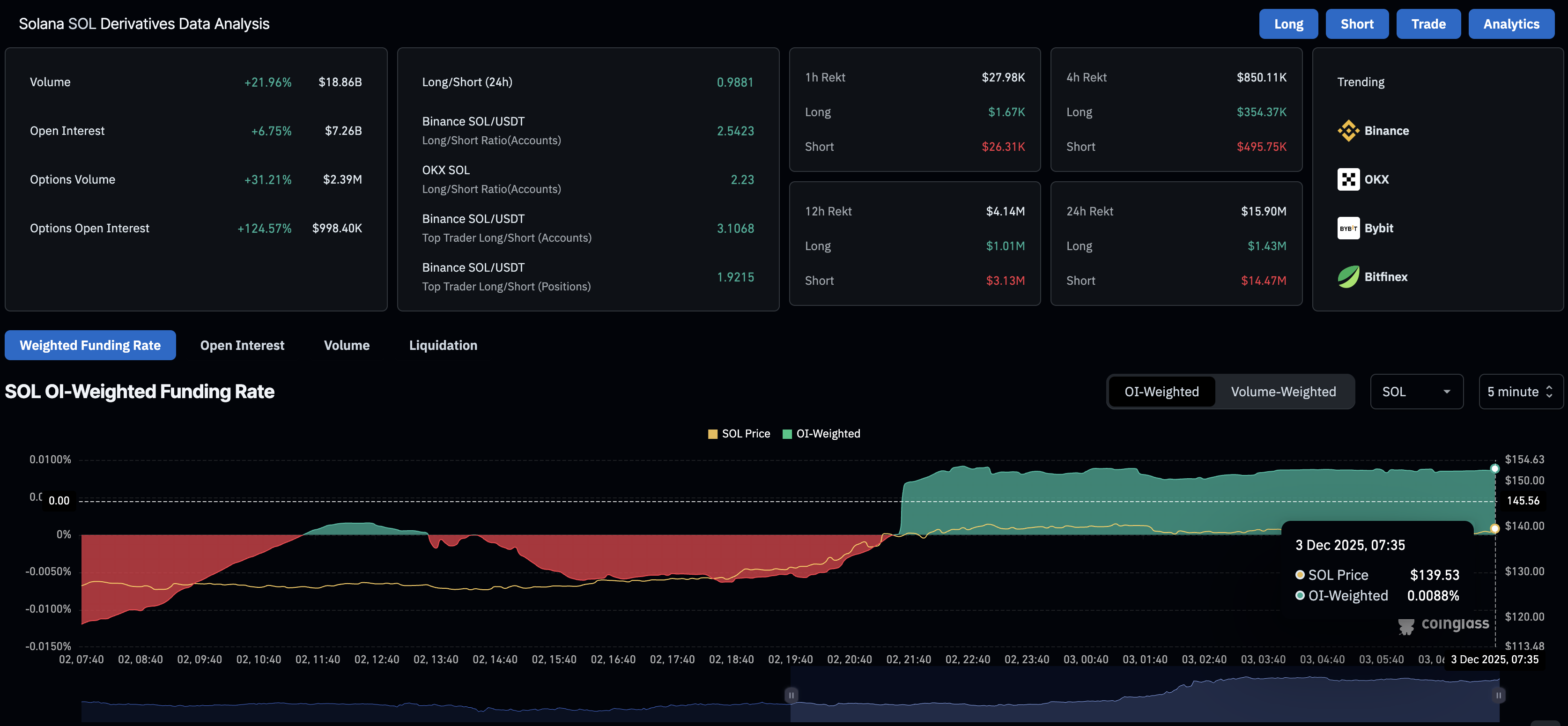 En línea con la demanda institucional, los derivados de Solana experimentan un aumento en la exposición al riesgo a medida que los inversores apuestan por una recuperación adicional. Los datos de CoinGlass muestran que el Interés Abierto (OI) de futuros de Solana se sitúa en 7.26 mil millones de dólares, un aumento del 6.75% en las últimas 24 horas, reflejando un aumento en el capital en riesgo.