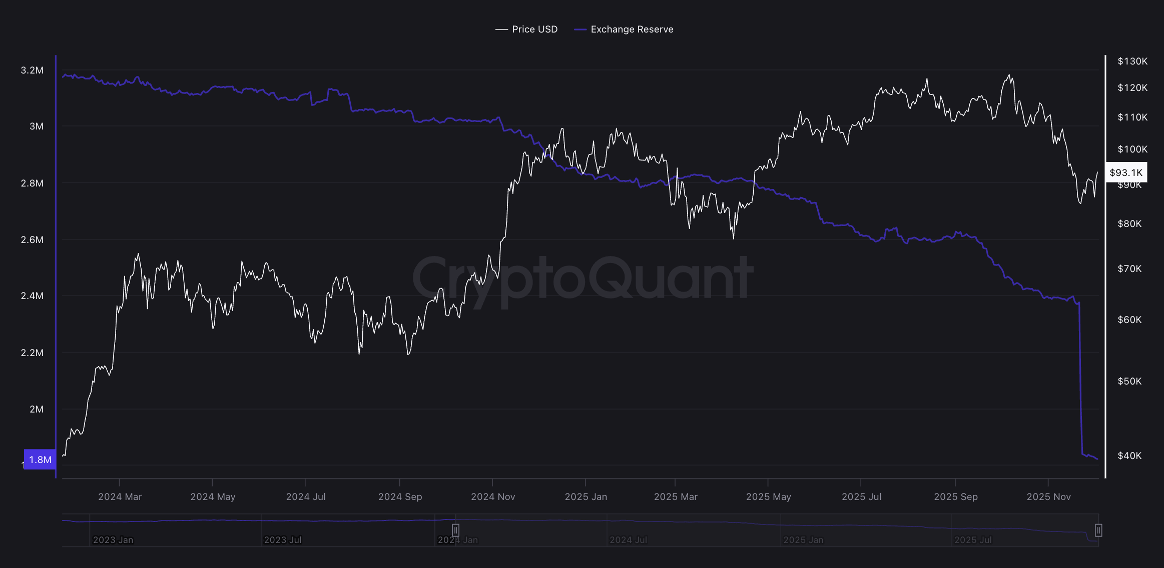 En el lado on-chain, las reservas de Bitcoin en las plataformas de intercambio han registrado recientemente una caída importante, cayendo a su nivel más bajo en años. Este fuerte descenso en los BTC mantenidos en los exchanges se considera típicamente alcista, ya que sugiere que las monedas se están moviendo a almacenamiento en frío, probablemente para una tenencia a largo plazo.