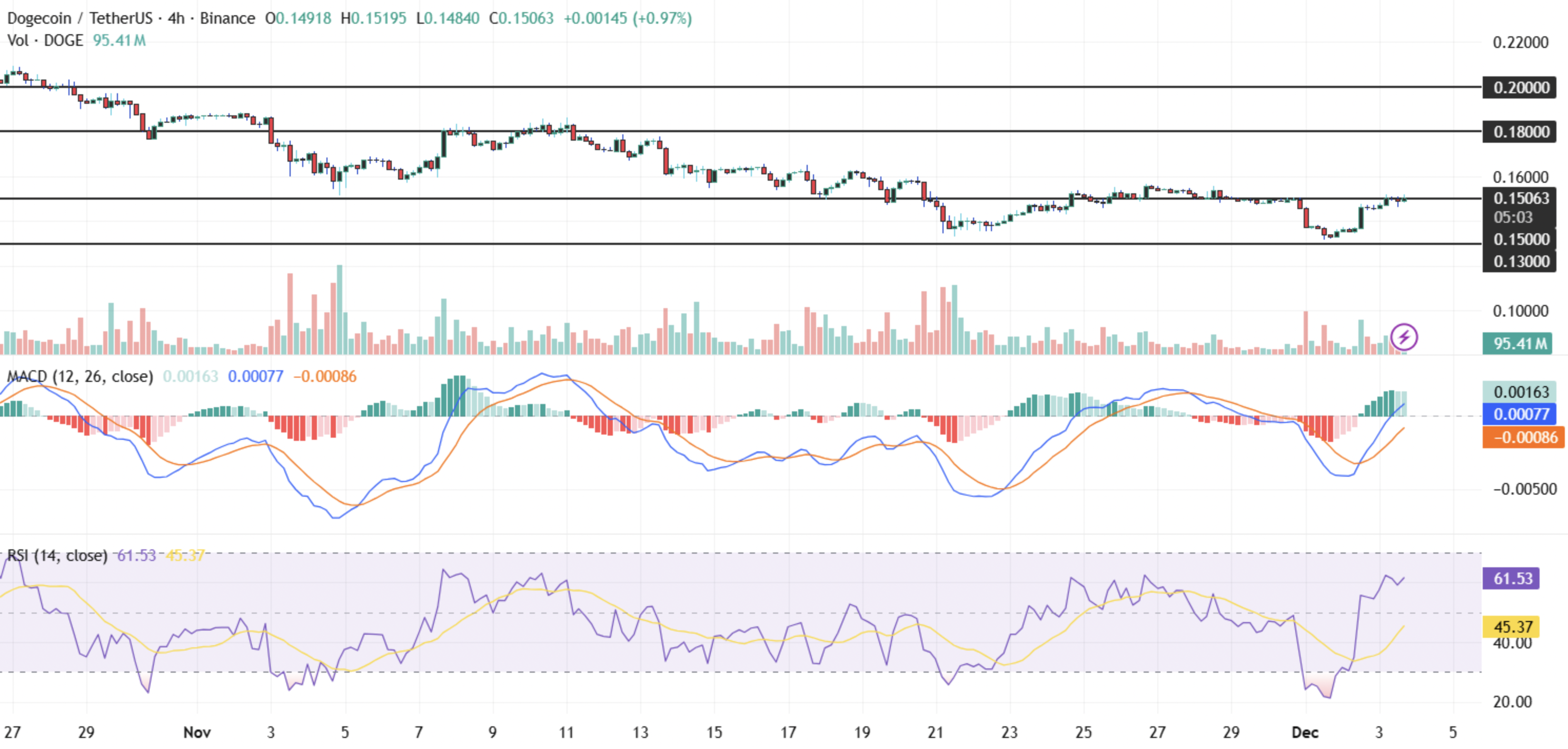Dogecoin cotiza alrededor de $0.15, a pesar de una caída del 0.75% en las últimas 24 horas. Este resurgimiento lleva a los inversores a preguntarse si es el inicio de un mercado alcista sostenido o solo una recuperación temporal. La recuperación general del mercado también ha dado un impulso a Dogecoin, con un aumento en el volumen de negociación que atrae la atención.