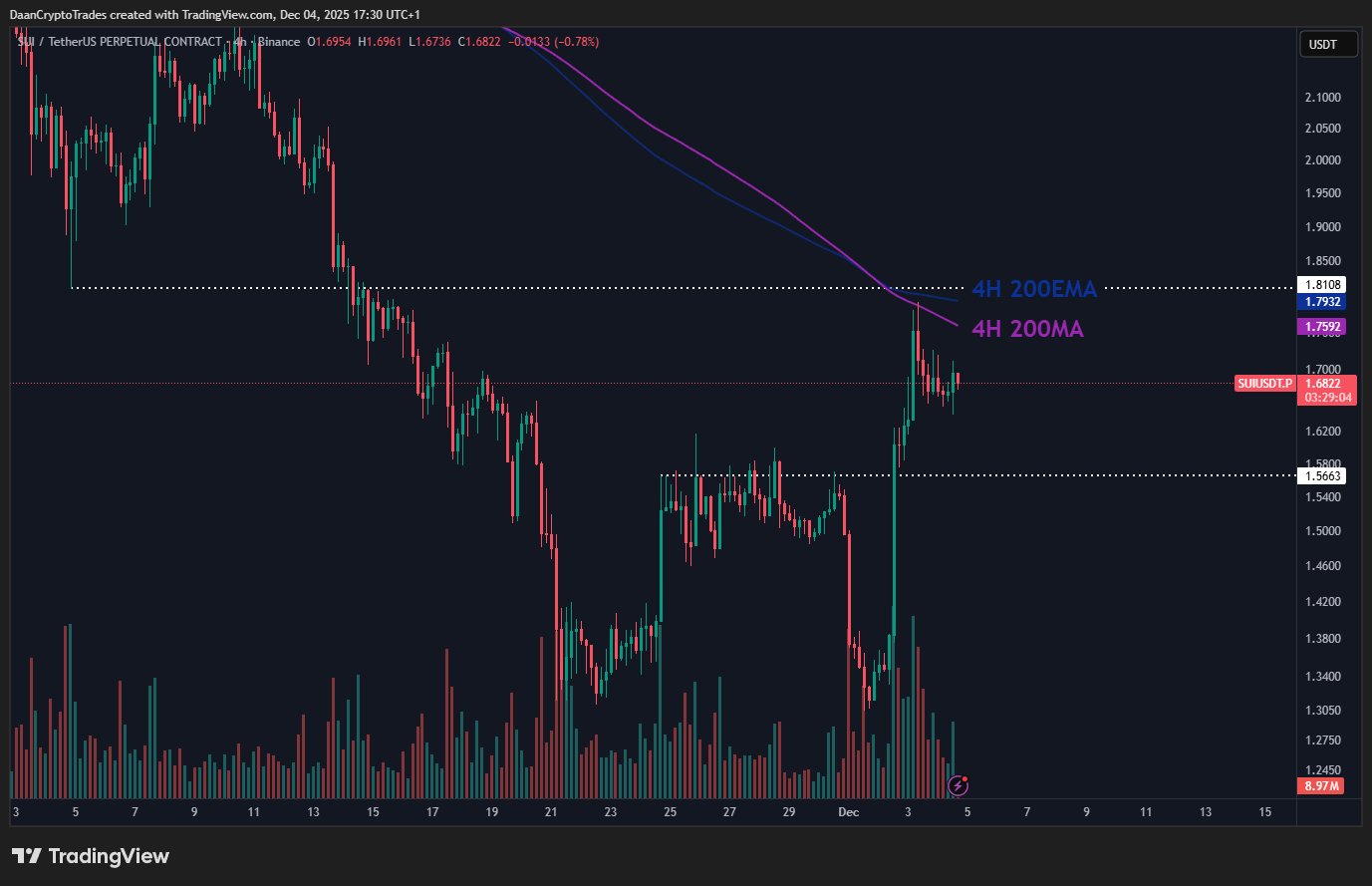 “Después de alcanzar un mínimo más alto y recuperarse de la caída del 1 de diciembre, SUI hizo un movimiento robusto. Actualmente se está consolidando con la resistencia de 4H 200MA/EMA justo por encima. Si esta resistencia rompe por encima de $1.81, apuntaré a niveles superiores a $2. Mientras tanto, el ETF apalancado 2x de SUI ha comenzado a cotizar en Nasdaq, ofreciendo más opciones de especulación para los inversores. ¡Como siempre, cuidado con la volatilidad!”