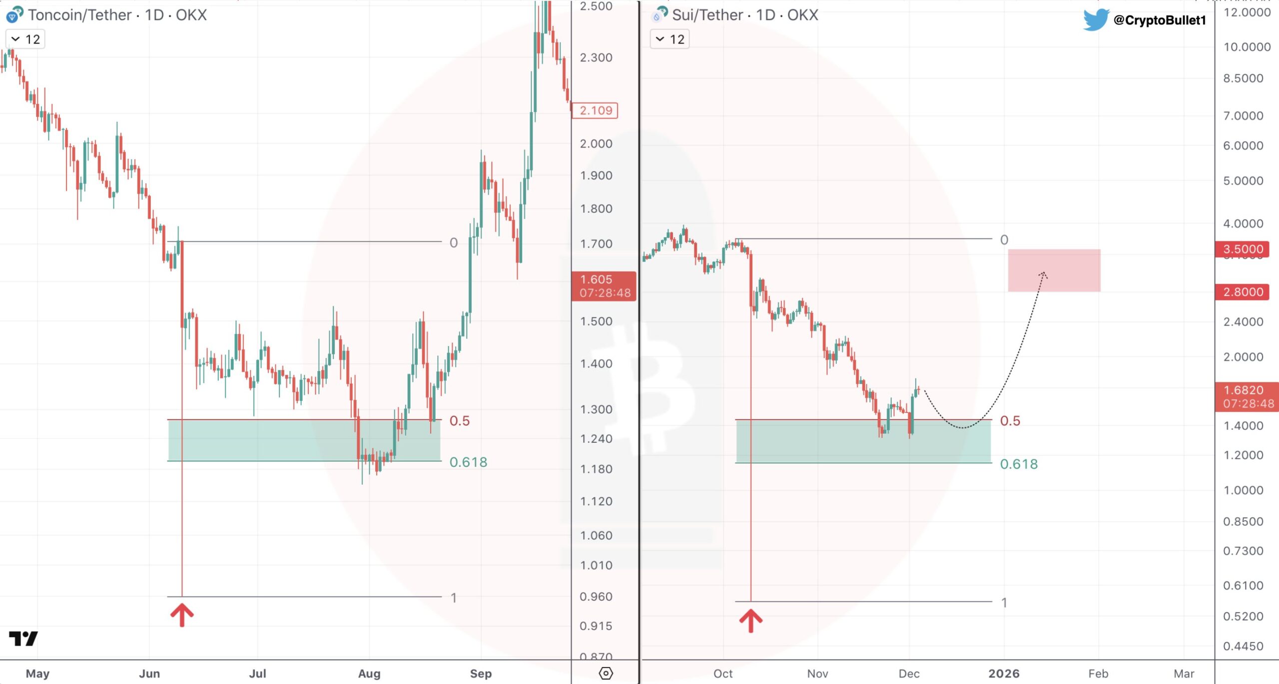 Bullet sugiere que SUI podría experimentar una situación similar a la que vivió TON Coin en junio de 2023. En ese entonces, TON vio una fuerte caída, alcanzando una disminución de 50 días que llegó al nivel de Fibonacci 0.5-0.618 antes de rebotar rápidamente. El analista, que compartió el gráfico anterior, señaló que este patrón podría verse en SUI y muchas criptomonedas, anticipando un pico entre $2.8 y $3.5.