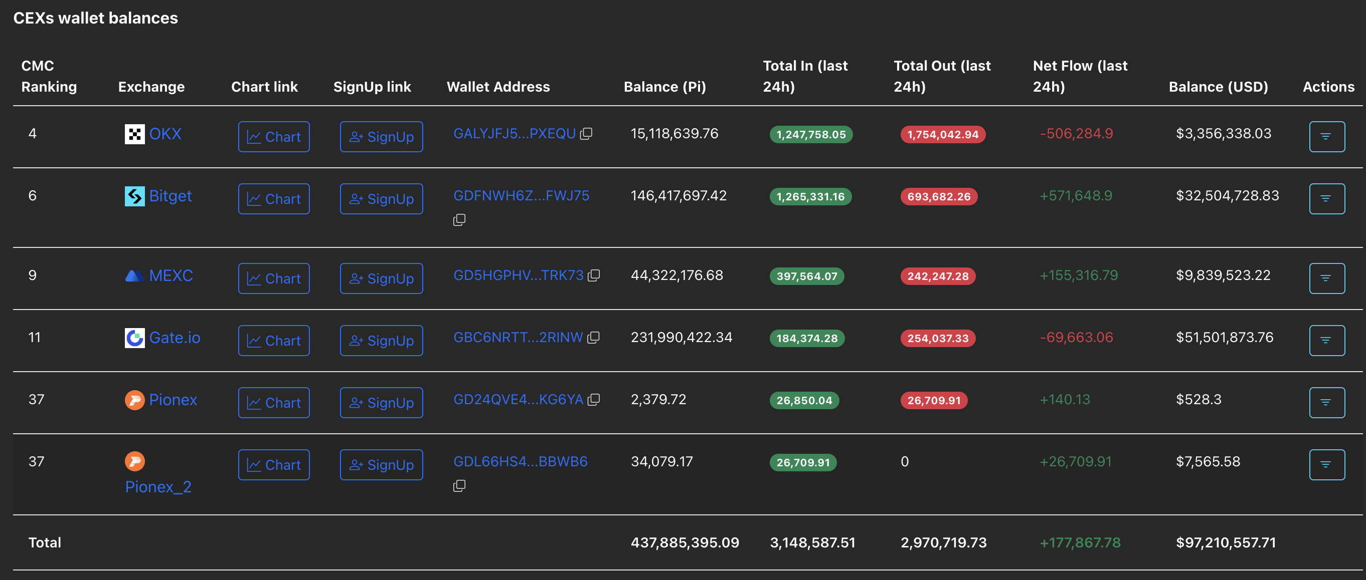 Un aumento constante en los depósitos de tokens PI en los intercambios indica una mayor presión de venta. Los datos de PiScan muestran que en las últimas 24 horas, las billeteras de los CEXs registraron una entrada de 177.867 tokens PI, llevando el saldo total a 437,88 millones de tokens.