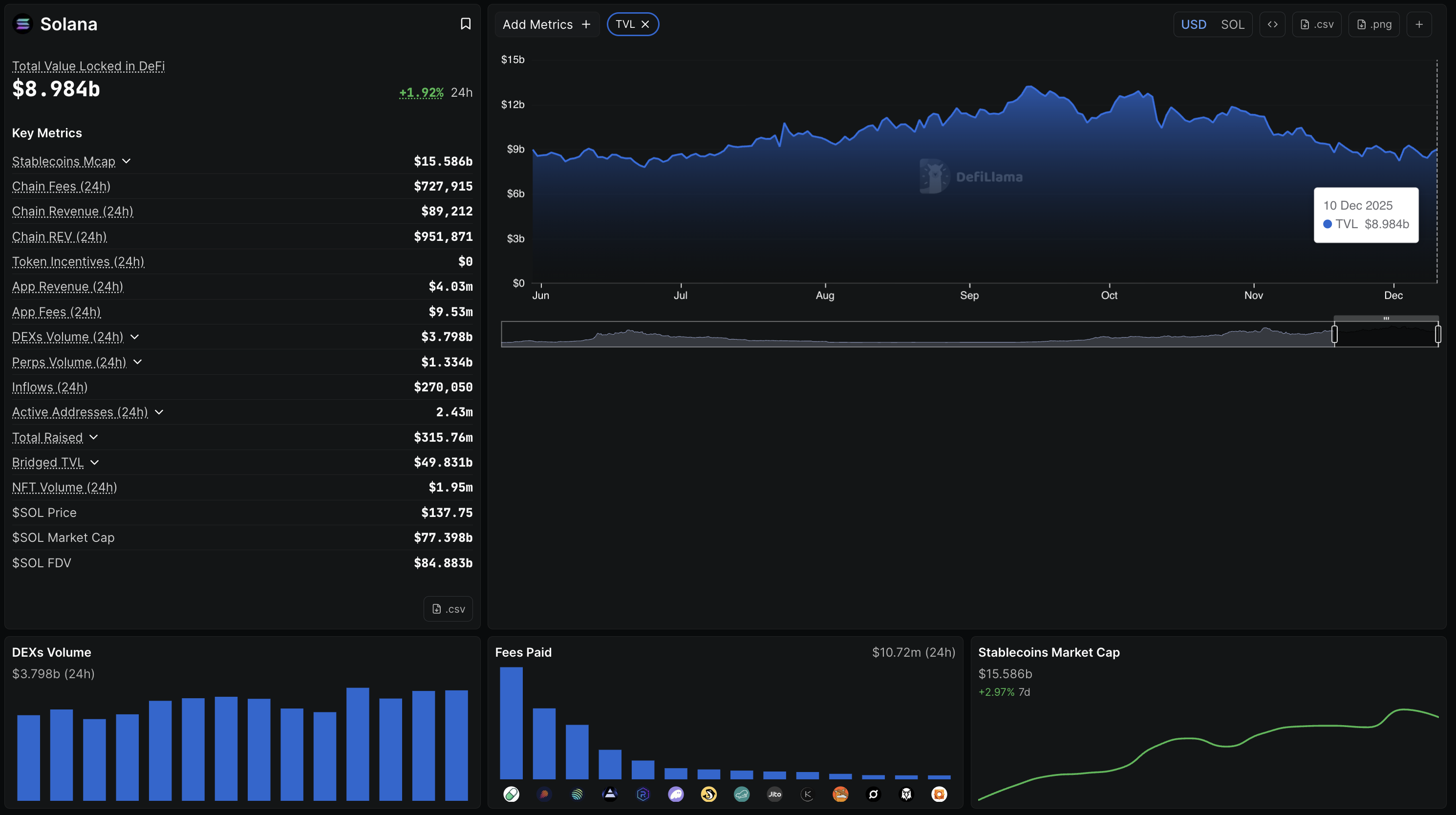 De manera similar, los datos de DeFiLlama muestran un aumento en la demanda en cadena para Solana. El Valor Total Bloqueado (TVL) en la blockchain de alta velocidad ha aumentado casi un 2% en las últimas 24 horas, alcanzando los 8.984 millones de dólares, mientras que las stablecoins han aumentado casi un 3% en la última semana, alcanzando los 15.586 millones de dólares.