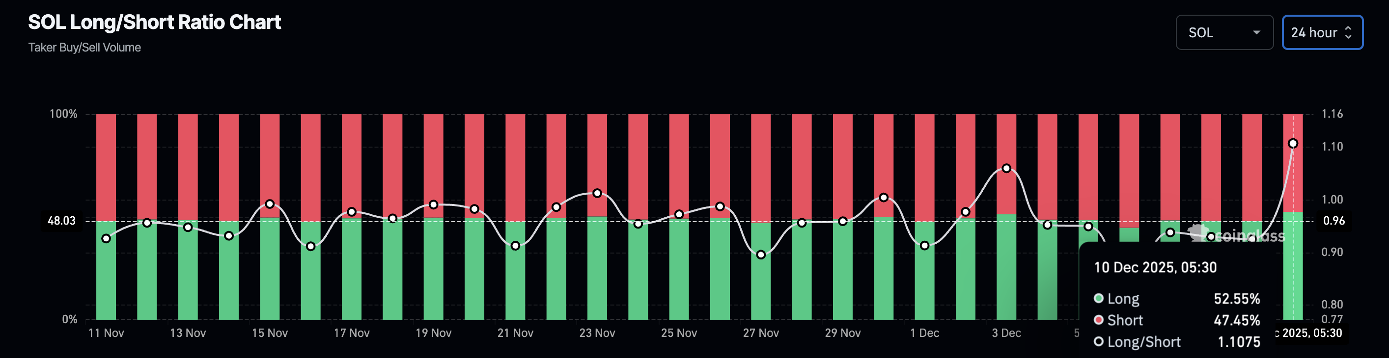 En la misma línea, el gráfico de la relación larga-corta indica un aumento pronunciado en las posiciones largas al 52.55%, desde el 44.83% del sábado. Este aumento en las apuestas alcistas se alinea con el aumento en el OI y la tasa de financiación, sugiriendo un cambio alcista en el mercado de derivados de Solana.