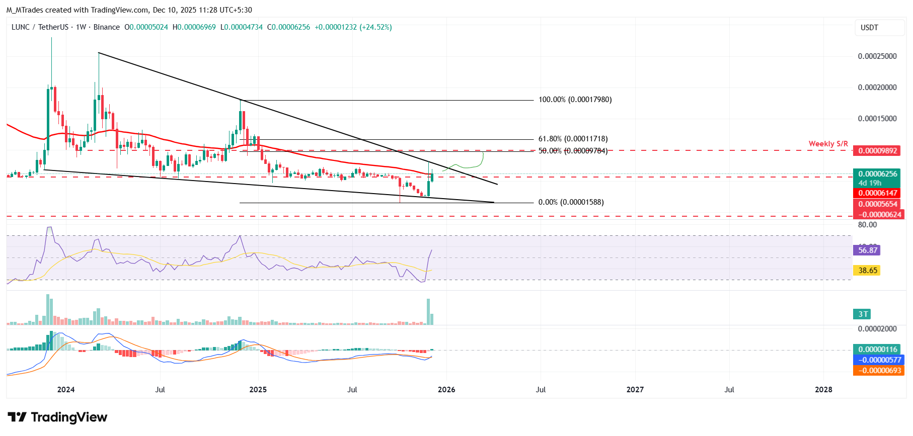 Si LUNC cierra por encima de la EMA de 50 semanas en 0.000056$ de manera semanal, podría extender el repunte hacia la próxima resistencia semanal en 0.000098$.