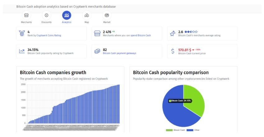 Según los últimos datos de comercio de Cryptwerk, Bitcoin Cash se posiciona ahora como la cuarta criptomoneda más adoptada para pagos, después de BTC, ETH y LTC. El aumento de BCH se debe a 2.476 comercios que actualmente aceptan Bitcoin Cash como forma de pago, junto con 82 pasarelas de pago especializadas.