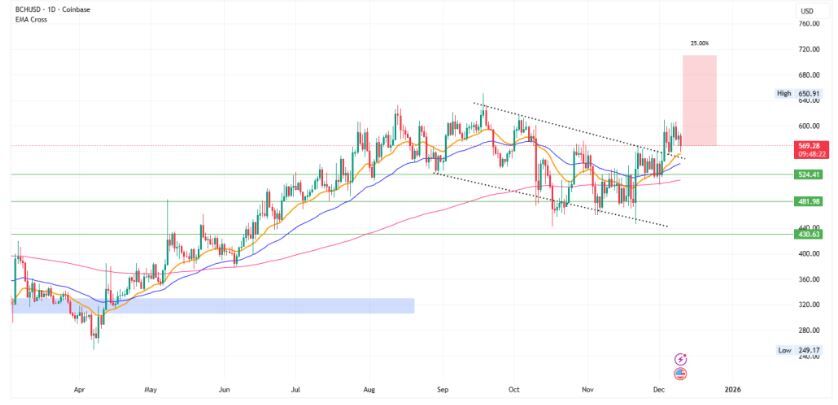 En el ámbito técnico, la acción del precio de Bitcoin Cash a lo largo del cuarto trimestre de 2025 ha formado una clara estructura de bandera alcista. En diciembre, este patrón se rompió con éxito y el precio se mantiene actualmente en el límite superior como soporte.