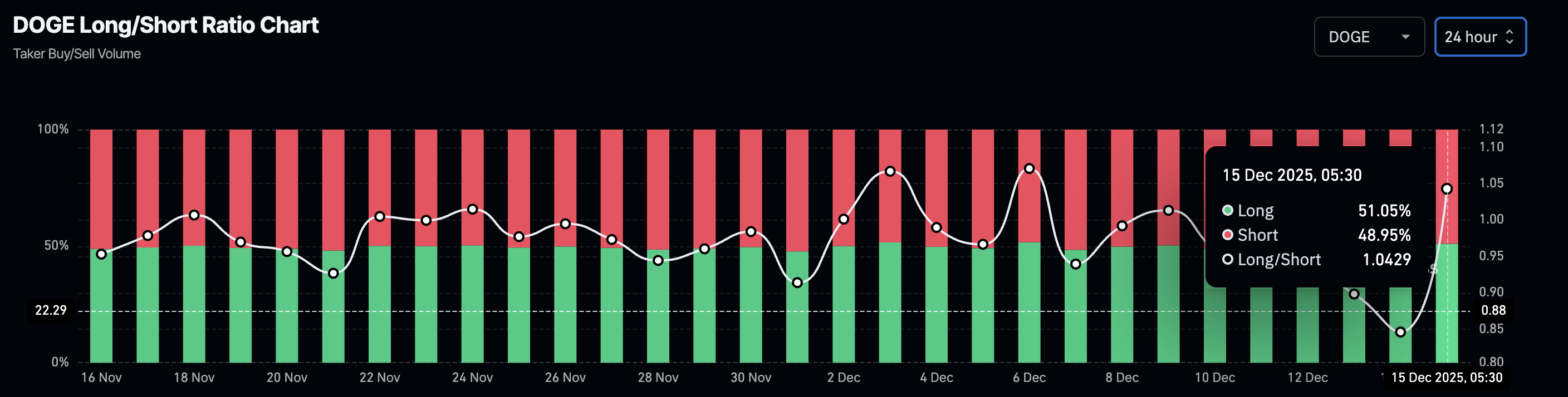 Dogecoin (DOGE) avanza casi un 2% en el momento de la redacción el lunes, recuperándose de una pérdida del 3.57% en el día anterior. La moneda meme corre el riesgo de salir de un rango de consolidación en medio de una débil demanda institucional y un declive en el impulso alcista. Sin embargo, el mercado de derivados observa un aumento en las apuestas alcistas a medida que los operadores anticipan un posible rebote, aumentando la exposición de capital en futuros de DOGE.