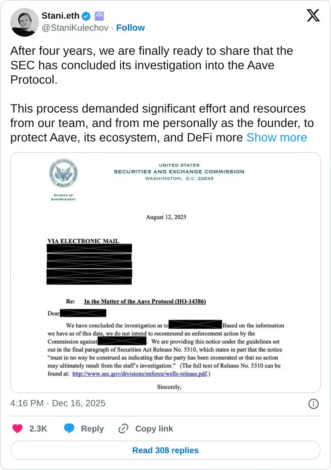 Stani Kulechov, fundador y CEO del protocolo Aave, anunció en su cuenta de X el martes que la SEC de EE.UU. ha concluido su investigación de 4 años.