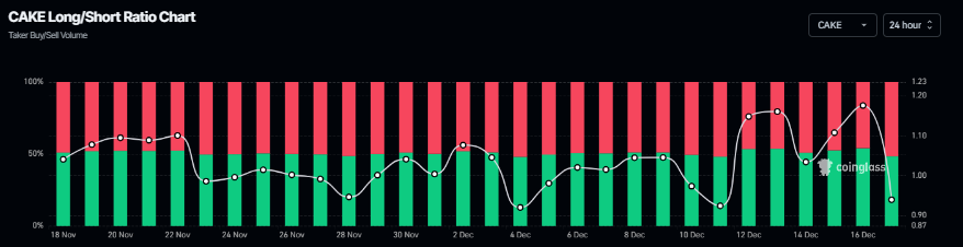 Además, la relación de largos a cortos de CAKE se sitúa en 0.92 el miércoles. Una relación por debajo de uno indica un creciente sentimiento bajista, ya que los traders están apostando a que el precio del activo caerá.