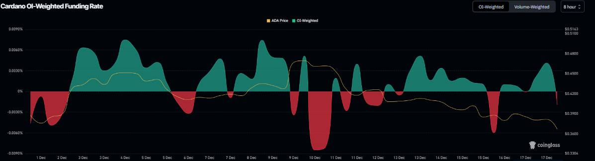 En el frente de los derivados, los datos respaldan aún más una perspectiva negativa para Cardano. Los datos de Tasa de Financiamiento Ponderada por OI de Coinglass muestran que el número de operadores que apuestan a que el precio de ADA caerá más supera a aquellos que anticipan un aumento de precio.