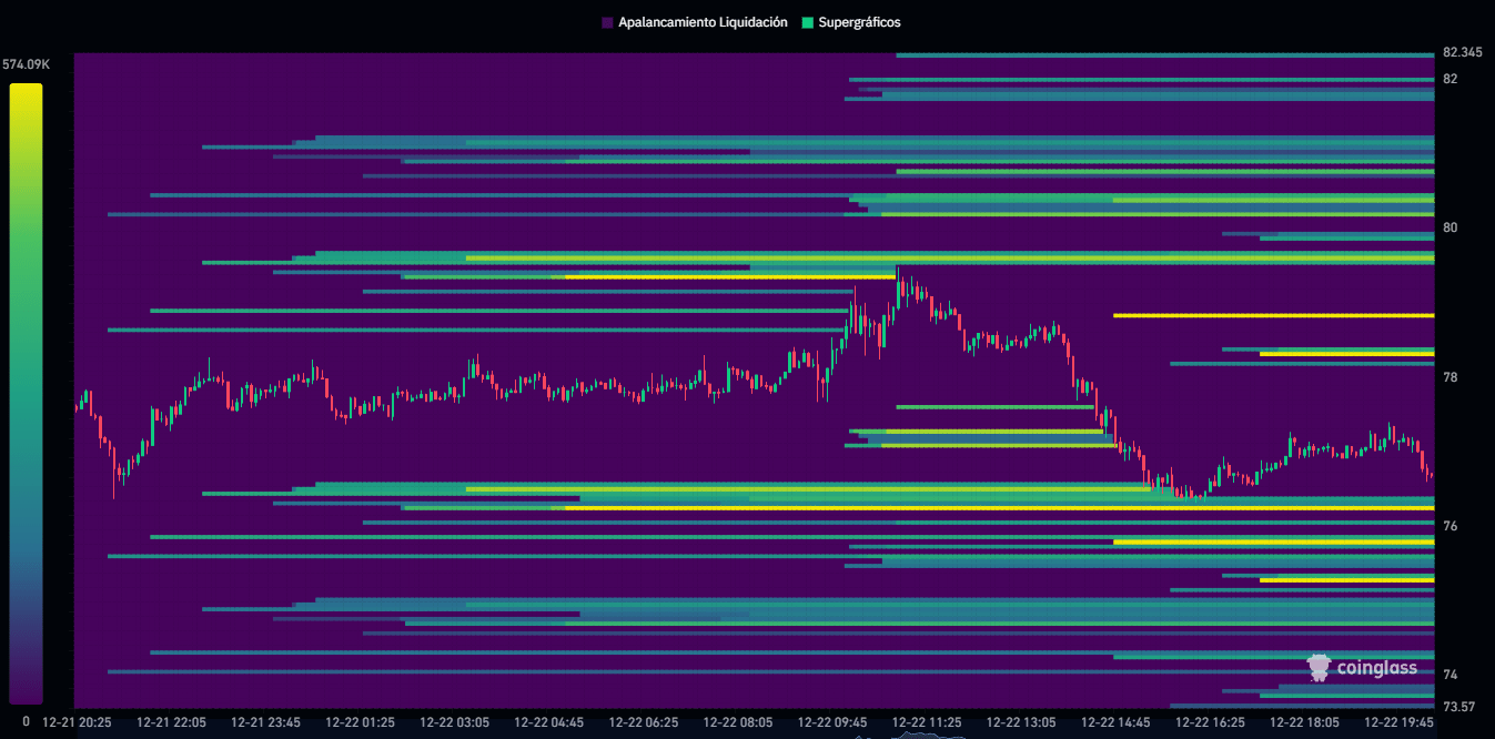 En este contexto, el mapa sugiere que, antes de cualquier intento de extensión al alza, el mercado podría buscar la liquidez pendiente ubicada en la parte inferior del rango, específicamente entre los $76 y $74. Estos niveles concentran un interés significativo y podrían actuar como objetivo previo dentro de la estructura actual.