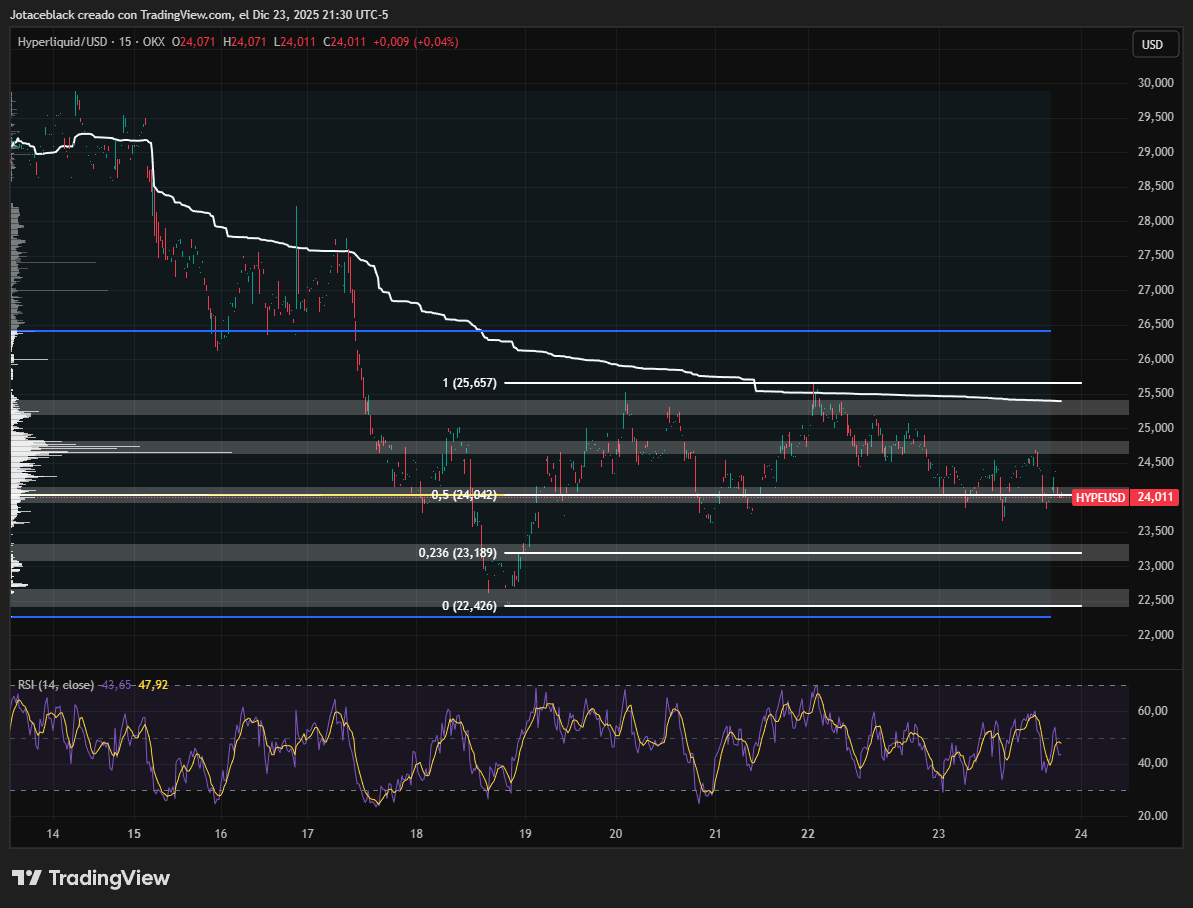 Dentro de este contexto, y considerando las zonas de interés del par HYPE/USD señaladas por el volume profile, el precio ha retrocedido hacia la línea central del indicador, coincidiendo además con el nivel de retroceso de Fibonacci 0,5%, ubicado en torno a los $24,04, tras el último impulso alcista que llevó al precio hacia la zona de $24,73. Esta confluencia refuerza la relevancia del nivel actual como punto de decisión para el corto plazo.