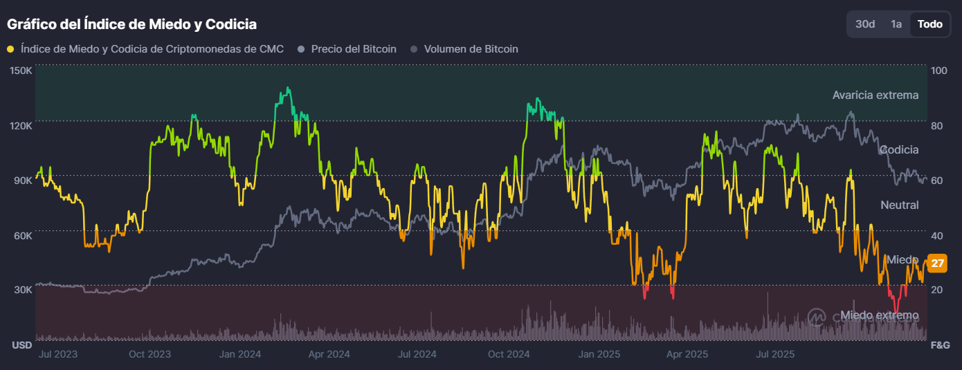 Esta mejora parcial sugiere que la presión emocional más intensa comienza a disiparse, pero sin una entrada clara de confianza. En este tipo de contextos, el mercado tiende a moverse de forma más técnica, priorizando tomas de liquidez y lateralizando, en lugar de desarrollar tendencias sostenidas.
