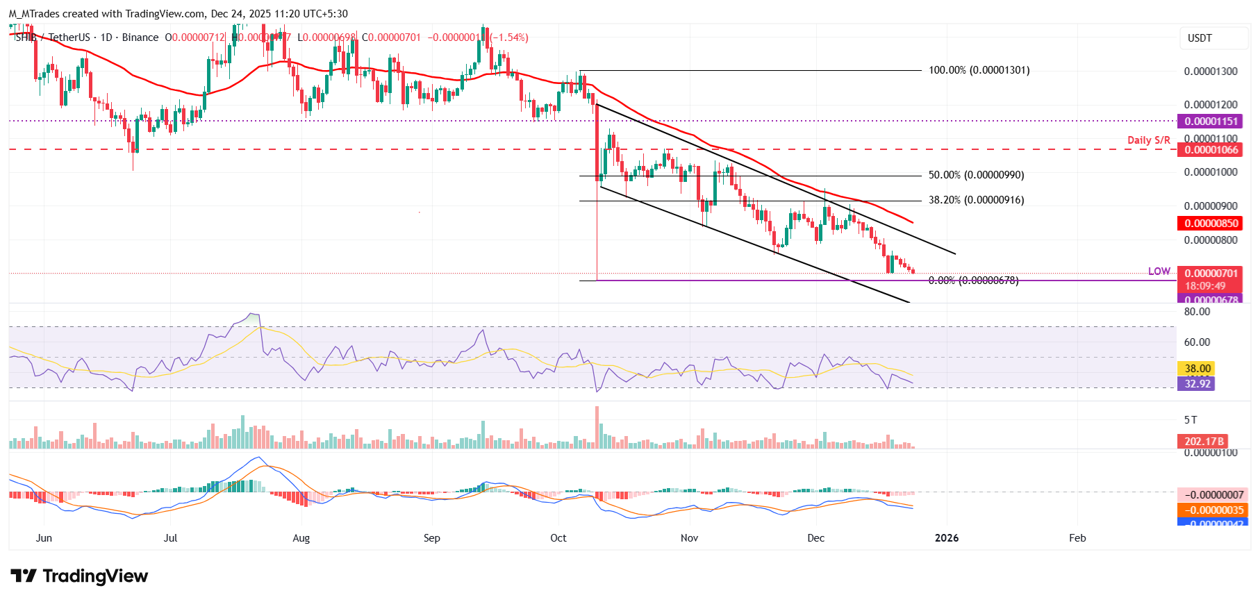 Si SHIB continúa su corrección, podría extender la caída hacia el mínimo anual de 0.0000067$ establecido el 10 de octubre.