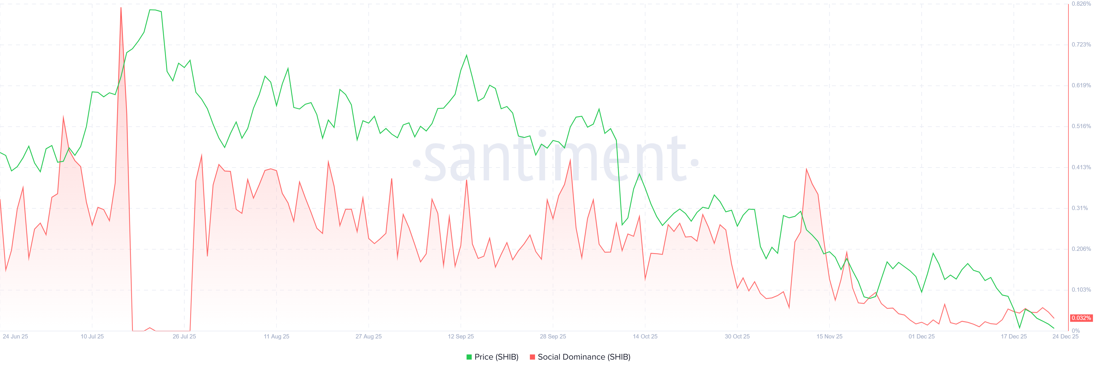 El indicador de Dominio Social de Santiment para Shiba Inu respalda una perspectiva bajista. El índice mide la participación de las discusiones relacionadas con SHIB en los medios de criptomonedas. Ha disminuido constantemente desde mediados de noviembre, alcanzando el 0.032% el miércoles, cerca de sus mínimos anuales. Esta caída indica un interés de mercado en declive y un sentimiento debilitado entre los inversores de SHIB.
