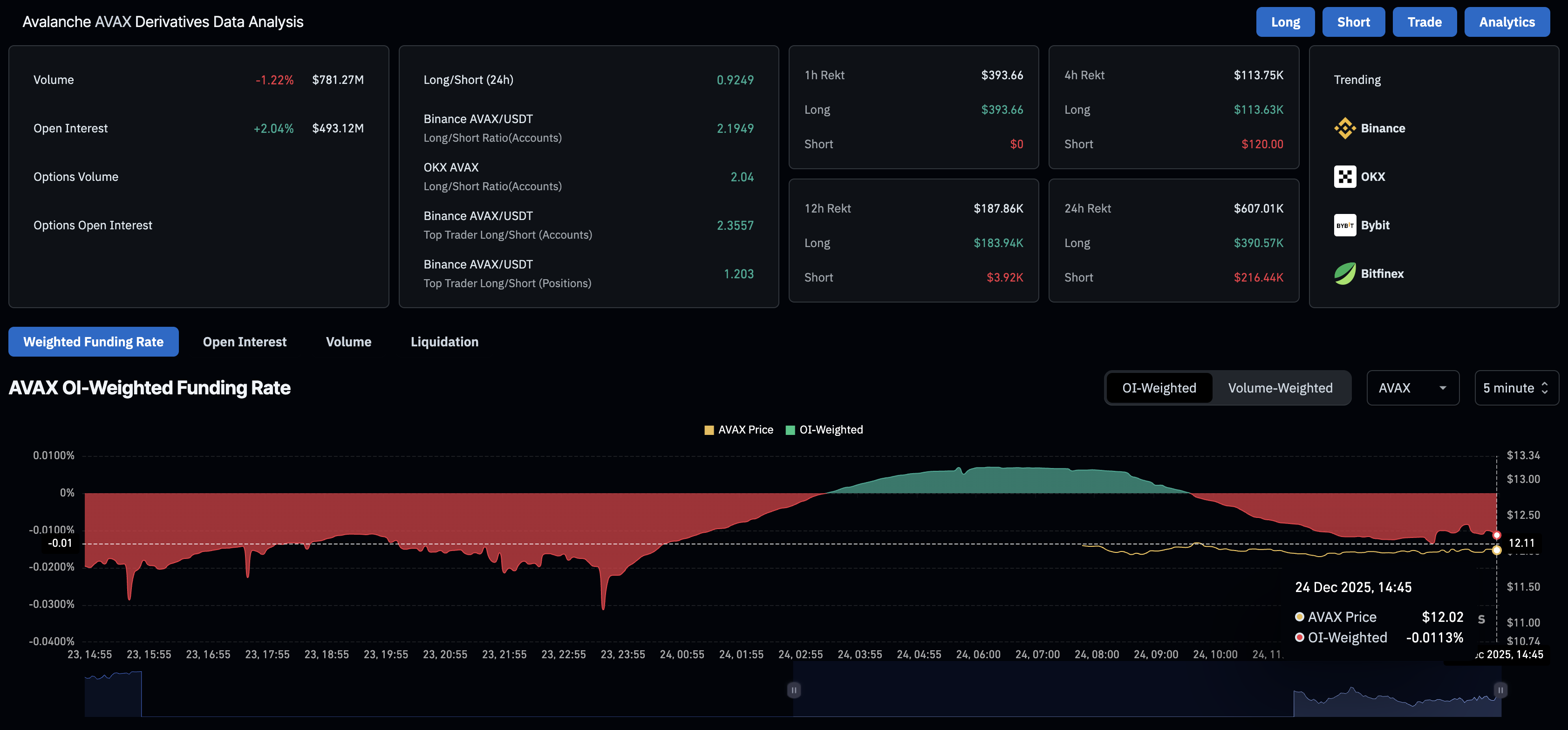 En el frente de derivados, Avalanche ve nuevas entradas de capital a medida que el interés abierto de futuros (OI) salta un 2.04% en las últimas 24 horas, alcanzando los 493.12 millones de dólares. Esto indica que los traders están construyendo nuevas posiciones, tanto largas como cortas.