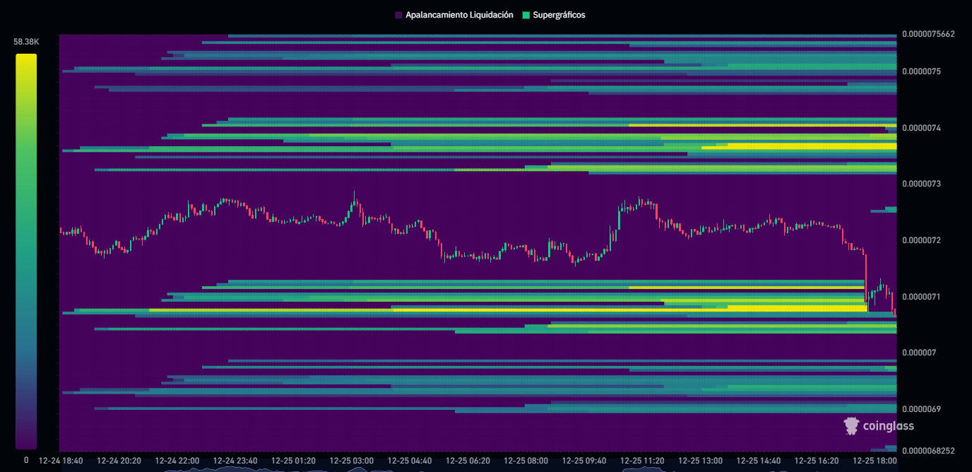 En la parte superior, destaca un bloque relevante de liquidez entre 0.00000730 y 0.00000745. Esta situación sugiere que, en caso de estabilización del precio, el mercado podría buscar ese rango como objetivo natural para una toma de liquidez al alza, especialmente si el flujo vendedor pierde intensidad.