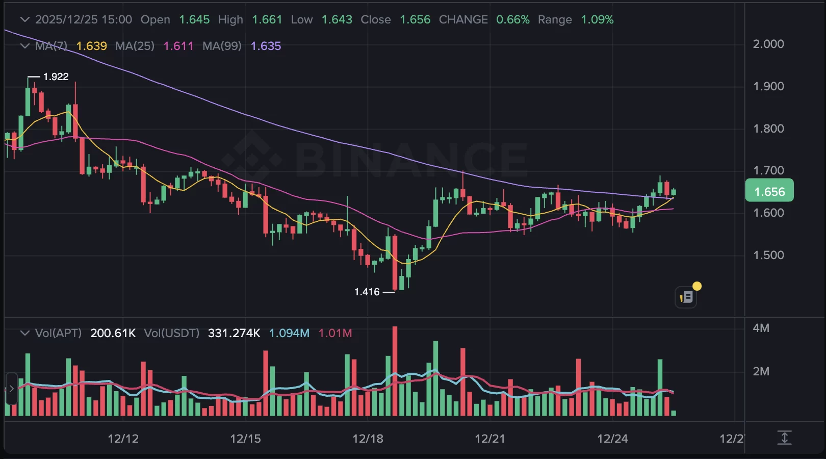 A corto plazo, el precio parece estar constreñido entre $1.56 y $1.69. Mientras que este rango ofrece oportunidades de comercio para los comerciantes, no ha habido una señal clara que indique un cambio en la dirección de la tendencia. Una ruptura sostenida por encima de $1.70 podría apuntar al rango de $1.90–$2.00. Por el contrario, una caída por debajo de $1.56 podría desencadenar nuevas caídas.