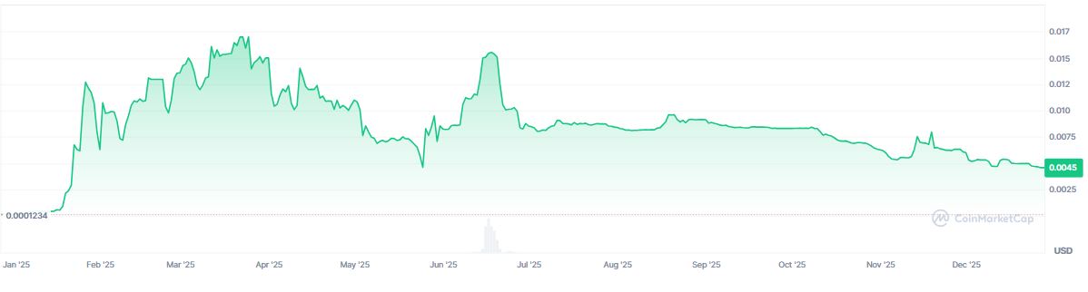 Durante el último año, el precio del activo pasó de 0,0001234 a 0,004584 dólares, lo que representa una subida anual del 3.615%.