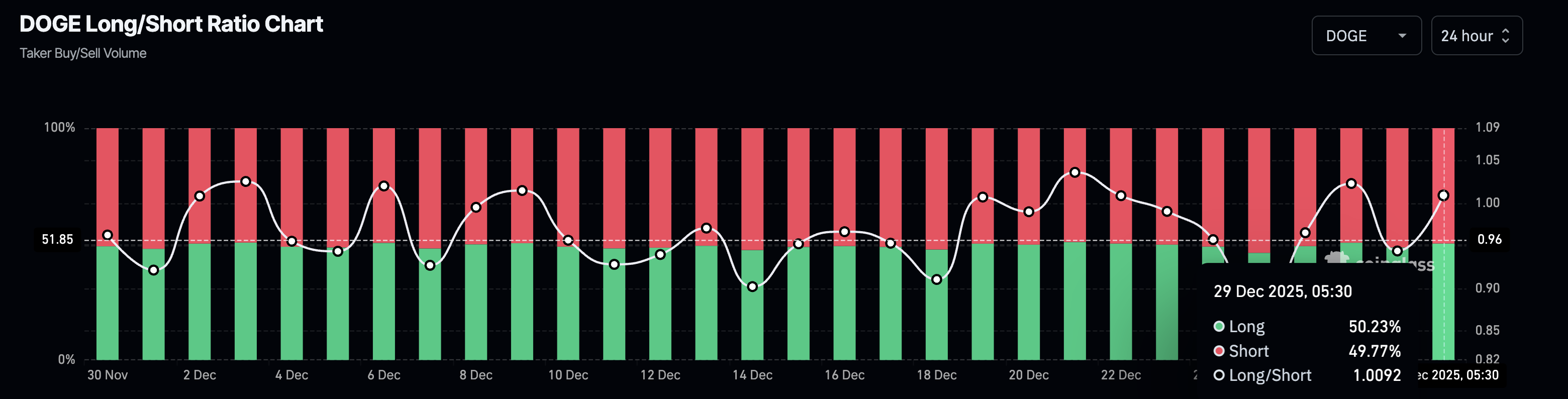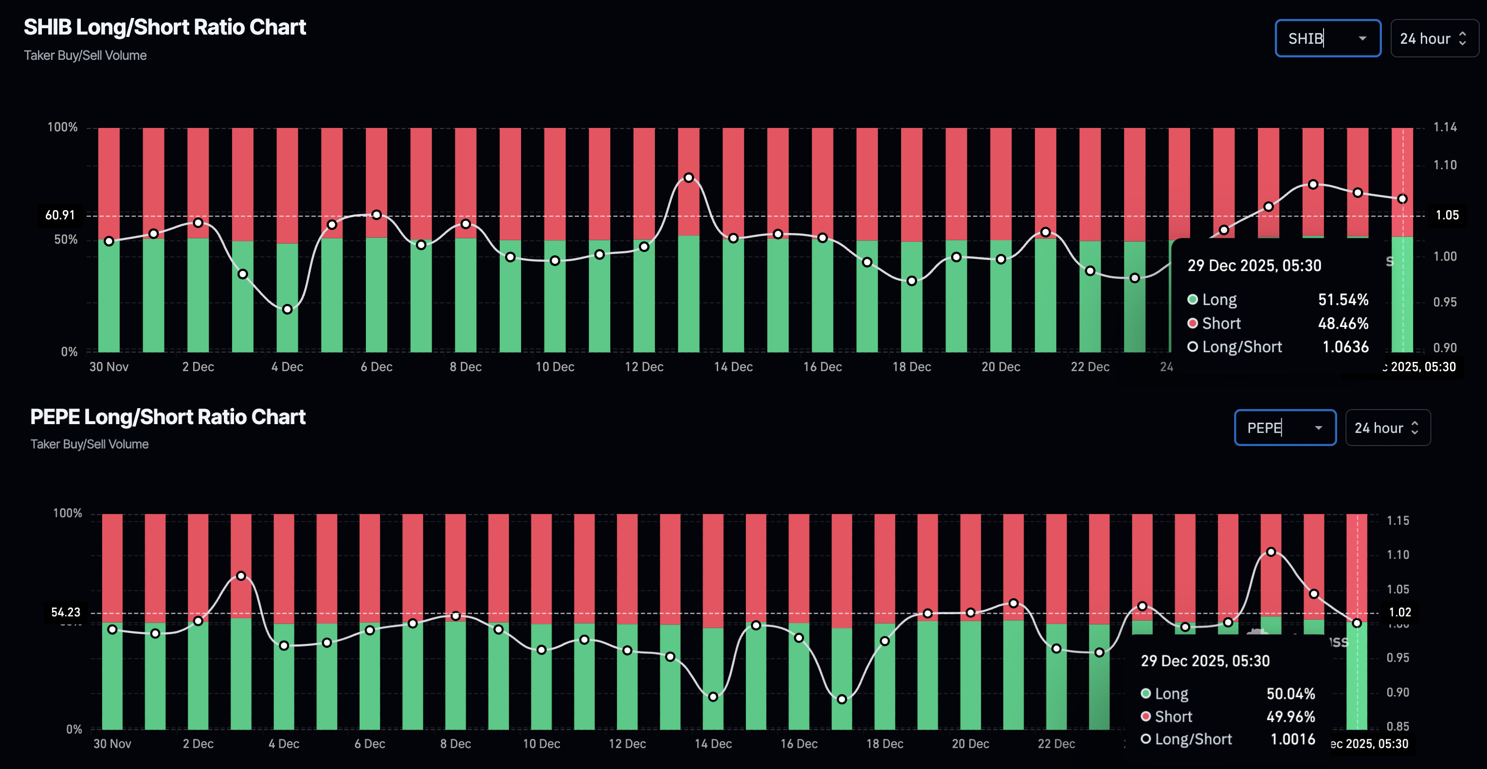 Los datos de CoinGlass muestran un sentimiento mayormente optimista hacia Dogecoin, Shiba Inu y Pepe. El gráfico de la relación largas-cortas muestra que las posiciones largas de DOGE representan el 50.23% de todas las posiciones activas, un aumento desde el 47.16% del día anterior. Un aumento en las posiciones largas sugiere que los traders anticipan más ganancias.
